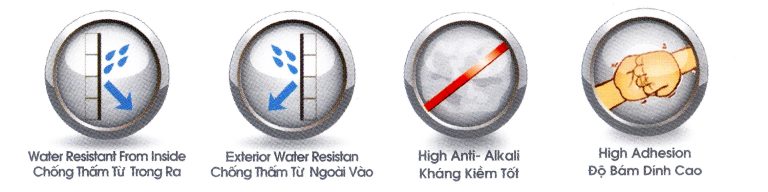 Chống thấm từ trong ra; Chống thấm từ ngoài vào; Kháng kiềm tốt; Độ bám dính cao.